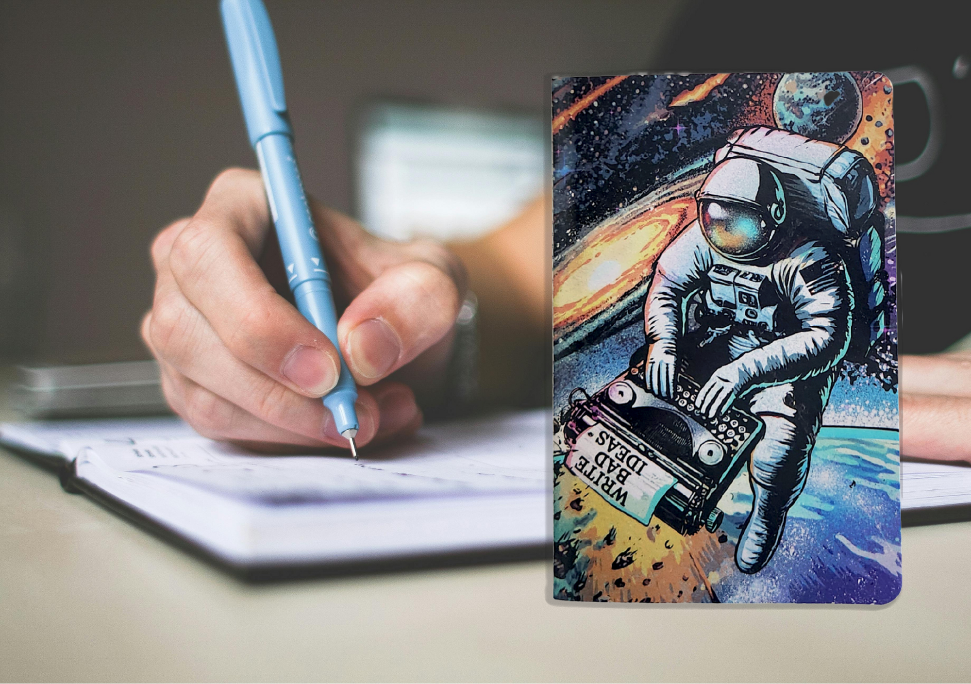 One monthly journal with Write Bad Ideas artwork encouraging you to leave perfectionism at the door. Flat, flexible binding with enough no-bleed pages for you to use up in a month.